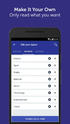- Your very own news feed - choose the topics you want to follow and/or block topics you don't like